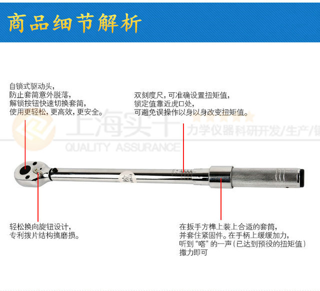 當緊固件的擰緊扭矩達到預置數值時,能自動發出訊號"嗒"的一聲,同時伴有明顯的手感振動。解除作用力后,扳手各相關零件自動復位. 外殼采用高強度特制合金鋼材質制造。